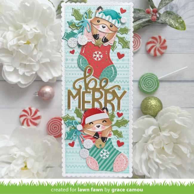 We’re stuffing Christmas stockings with lots of joy this year! The top of the stocking is open for tucking in a cute critter, or a sweet treat. Use your favorite colors of cardstock (shiny is super fun) or patterned paper for a unique sentiment each time!
