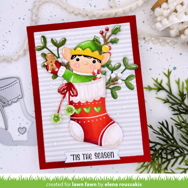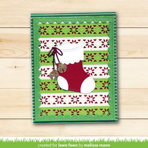 Coordinating set ideas: Add the treats to your stocking using the elements from Build-A-Critter Christmas Accessories. Tuck a super cute fritter inside your stocking using the friends from Build-A-Critter Collection. Use a pretty backdrop like Quilted Diamond Backdrop for a quick greeting with lots of pizzaz. Try inking up a special background with your favorite Stencil too!