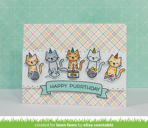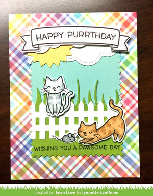 Want to create purrfect cards and crafts? This set features four adorable cats, accessories, and matching sentiments that are perfect for animal lovers!Stamp the stretching cat in front of the cat food can, and add the “happy purrthday” sentiment for a quick birthday card. Layer the sleeping cat and the mouse toy on the bed, and add the “mew + you, let’s be friends furever” sentiment for a cute friendship card.Coordinating Lawn Cuts: Meow You Doin'? Lawn CutsCoordinating set ideas: Use the window from Wonderful Window to create a scene with a cat sleeping on the window sill. Use a dog from Happy Howloween and/or the mouse from Elphie Selfie to create a cute “friends furever” card.approximate stamp sizes:[upper left cat] 1 1/2" x 1 1/8"[sitting cat] 1 1/4" x 1 1/8"[cat bed] 1 1/2" x 7/8"["meow"] 1 1/4" x 1/4"["happy purrthday"] 2 5/8" x 3/16"Made with care in the USA!