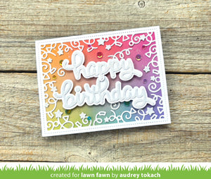 Add an outline border effect to your Scripty Birthday Lawn Cut! Layer Scripty Birthday on top of the outline using the embossed “birthday” as a guide for easy placement. Use your favorite color of cardstock (shiny is super fun) or patterned paper for a unique look each time!